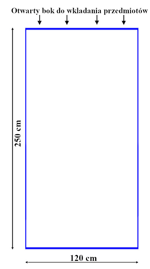 Worek ma szerokość 120 cm, a więc obwód worka równa się 240, obwód pakowanych przedmiotów musi być zatem mniejszy od obwodu 240 cm czyli nie powinien przekraczać np 228 cm.